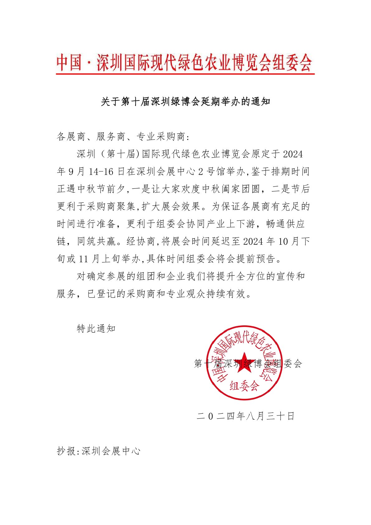 深圳(第十屆)國際現代綠色農業博覽會原定于2024年9月14-16日在深圳會展中心2號館舉辦,鑒于排期時間正遇中秋節前夕,一是讓大家歡度中秋闔家團圓,二是節后更利于采購商聚集,擴大展會效果。為保證各展商有充足的時間進行準備,更利于組委會協同產業上下游暢通供應鏈,同筑共贏。經協商,將展會時間延遲至2024年10月下旬或11月上旬舉辦,具體時間組委會將會提前預告。對確定參展的組團和企業我們將提升全方位的宣傳和服務,已登記的采購商和專業觀眾持續有效。